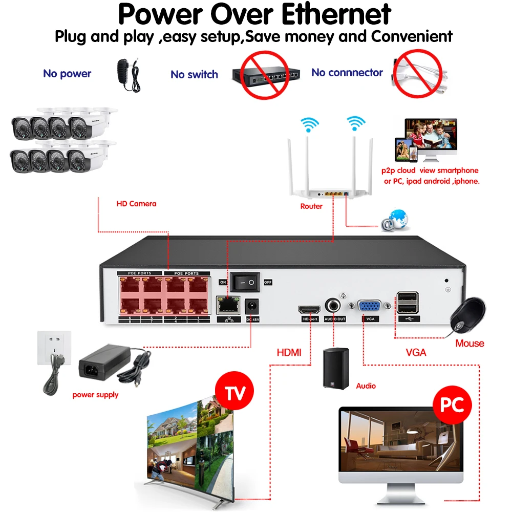 AHCVBIVN H.265 8CH 48V POE CCTV System 4.0MP POE IP Waterproof In/Outdoor Day/Night Camera Video Se