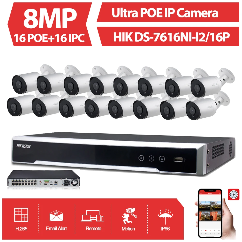 HIGH QUALITY NEW 16CH CCTV System kit Ultra 8MP Outdoor Security POE Camera with Hikvision 8 POE NVR DS-7616NI-I